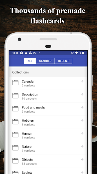 Afrikaans flashcards app includes 4000+ premade Afrikaans flashcards which cover the most used Afrikaans words from 9 categories: