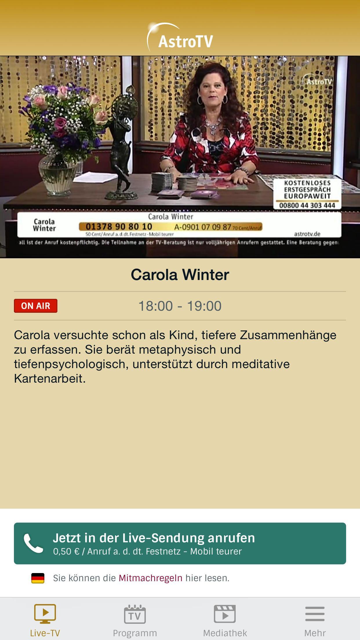 Never miss your favorite advisor again! With the AstroTV app, you can now watch our TV program live on your smartphone in HD quality around the clock.