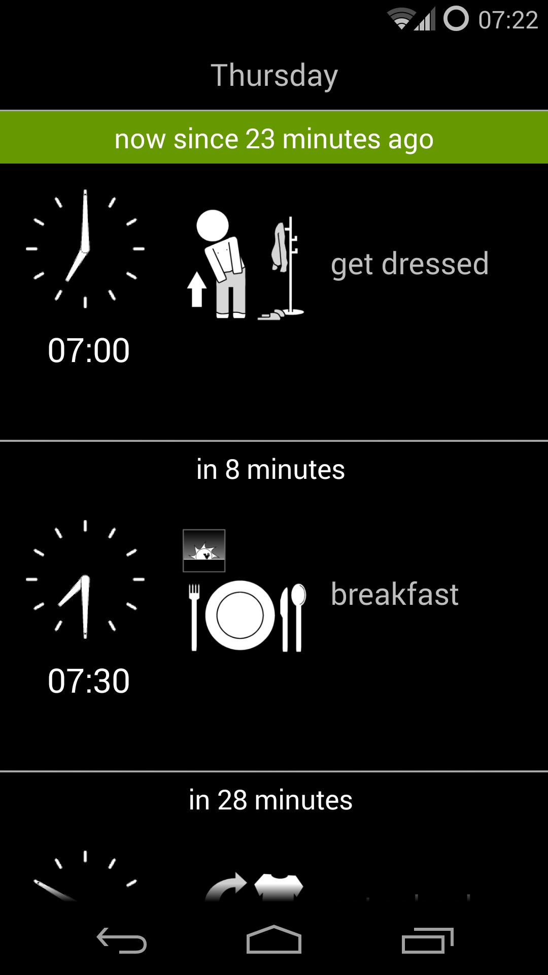 Use detailed visual schedules shows scheduled activities and tasks with pictures, speech and alarm notifications. Created for people who need some extra help with their daily routine.