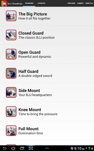 This app covers a complete system for learning BJJ. It starts with the Roadmap concept so that you get the complete big picture of the art of Brazilian Jiu-jitsu (along with the concepts, techniques and strategies used by almost every advanced player).