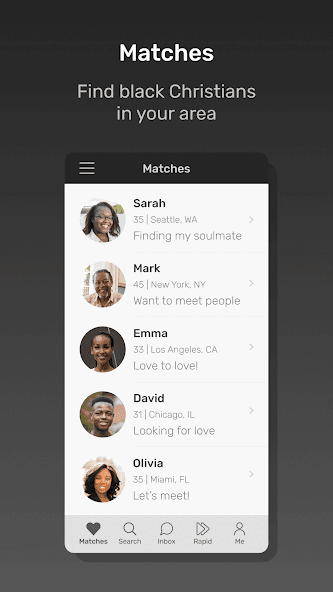 The Black Christian Soulmates app also has additional features to find men and women to mingle and chat with: