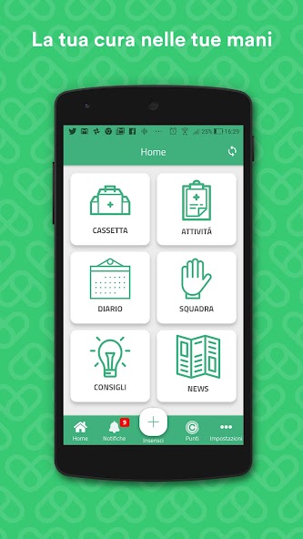 - Activities: a simple and intuitive system reminds you to take medication and make measurements at the scheduled times; the app also allows the management of the therapies of non self-sufficient people you care for (like the elderly in the family).