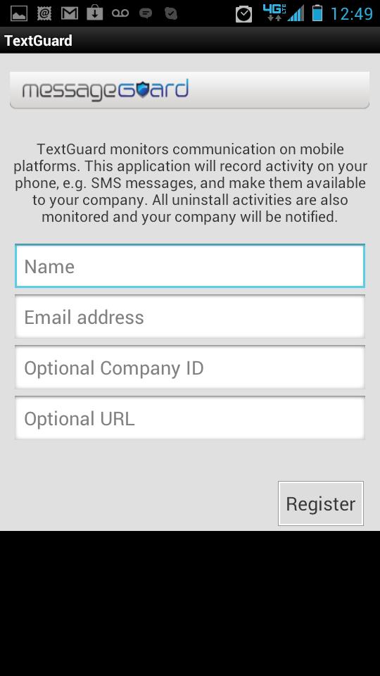 MessageGuard is a Text Message (SMS) monitor and Call Logging application for Enterprises who need to monitor their employees phones and mobile devices. This is not a mobile spying software and we are not responsible for any spy use prohibited by law. The application can work with 1 or 50,000 users. Please contact Smarsh at 1-866-SMARSH1 for more information or see http://www.smarsh.com/text-archiving-solutions.
