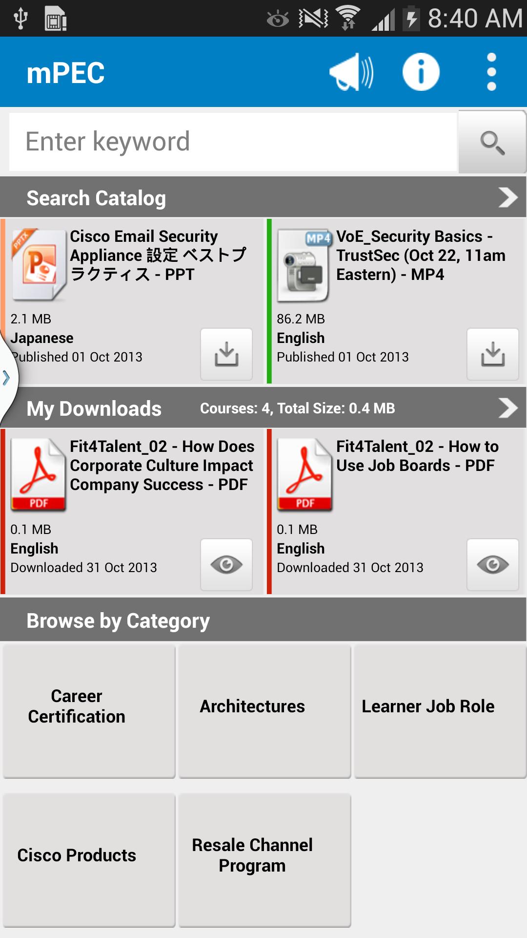 With mPEC (Mobile PEC), the new Android app you can access the training you need when or where you want to view it. Access MP4 videos, PowerPoint files and PDF files all from mPEC. Use mPEC to stay up-to-date with Cisco products, solutions, services, specializations and certifications.