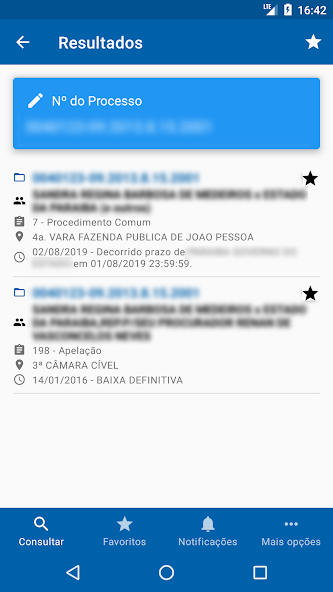 As a search criterion, you can use the case number, party name, or attorney's OAB number. In addition, you can bookmark processes so you can always have your data at hand, even without your internet connection. By default, if a bookmarked process is moved, the application will notify you.