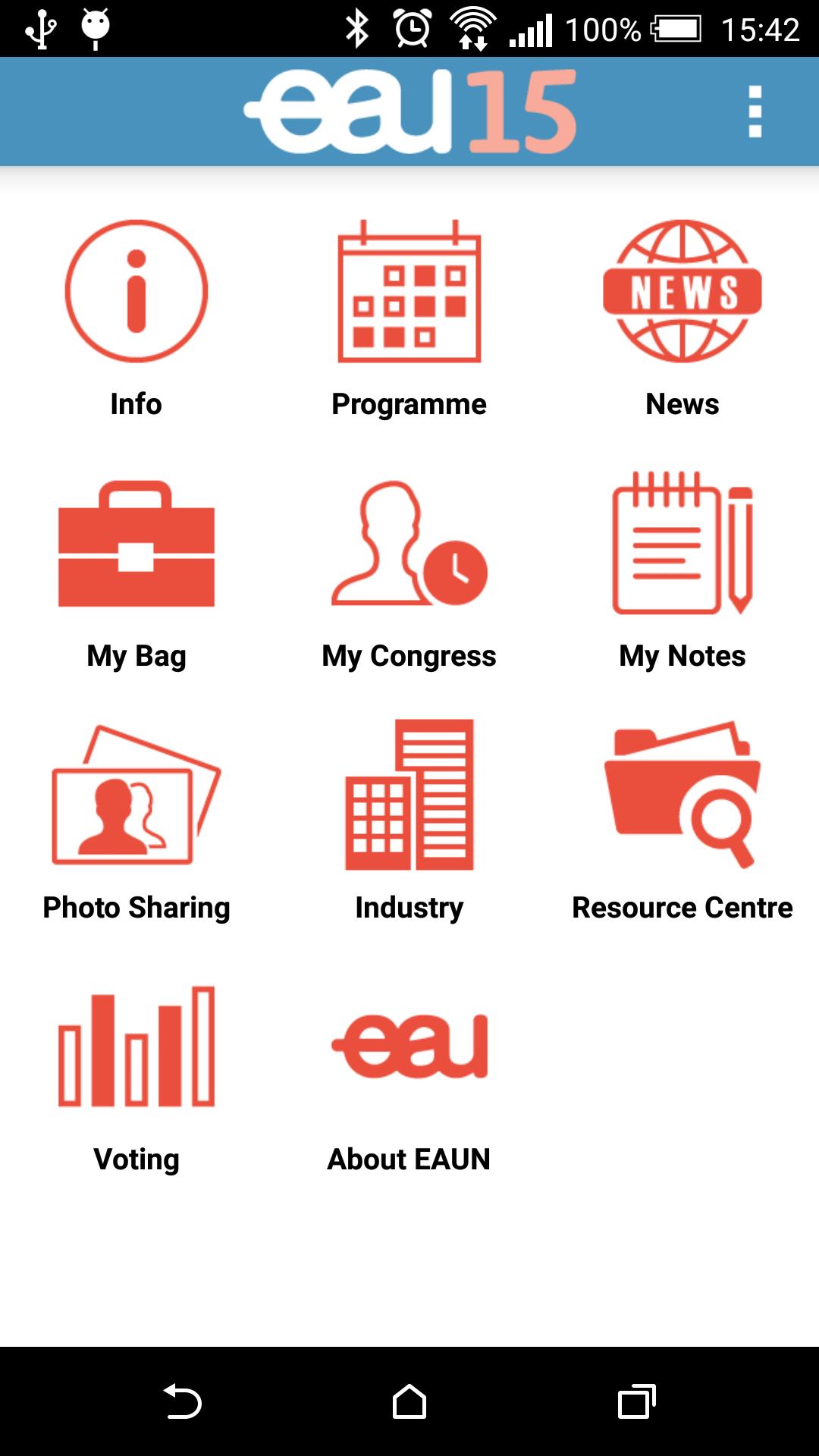 With the EAUN15 app you have instant access to the most important information of the 16th International EAUN Meeting via your smartphone. You will be able to browse the complete scientific programme by day, topic, speaker, and create your own personal programme thanks to the planner. You can easily find the rooms and exhibitor stands on the floorplans and receive daily news. In your personal congress bag you can save all relevant information, which you can email after the congress so you can easily review all scientific content at a later stage. Once installed you can access the content with your congress registration login (MyEAU).