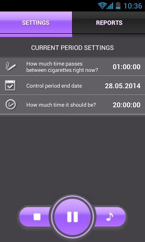 Our application will draw up an individual schedule for you and will signalize you every time it's time to smoke. Just start smoking «according to the alarm clock». You won’t even notice how the number of cigarettes smoked will decrease, and the time between smoke breaks will increase. At some point, it will appear that you smoke only once a day, and this single cigarette doesn’t attract you anymore. You can quit smoking completely, or smoke only once in a while.