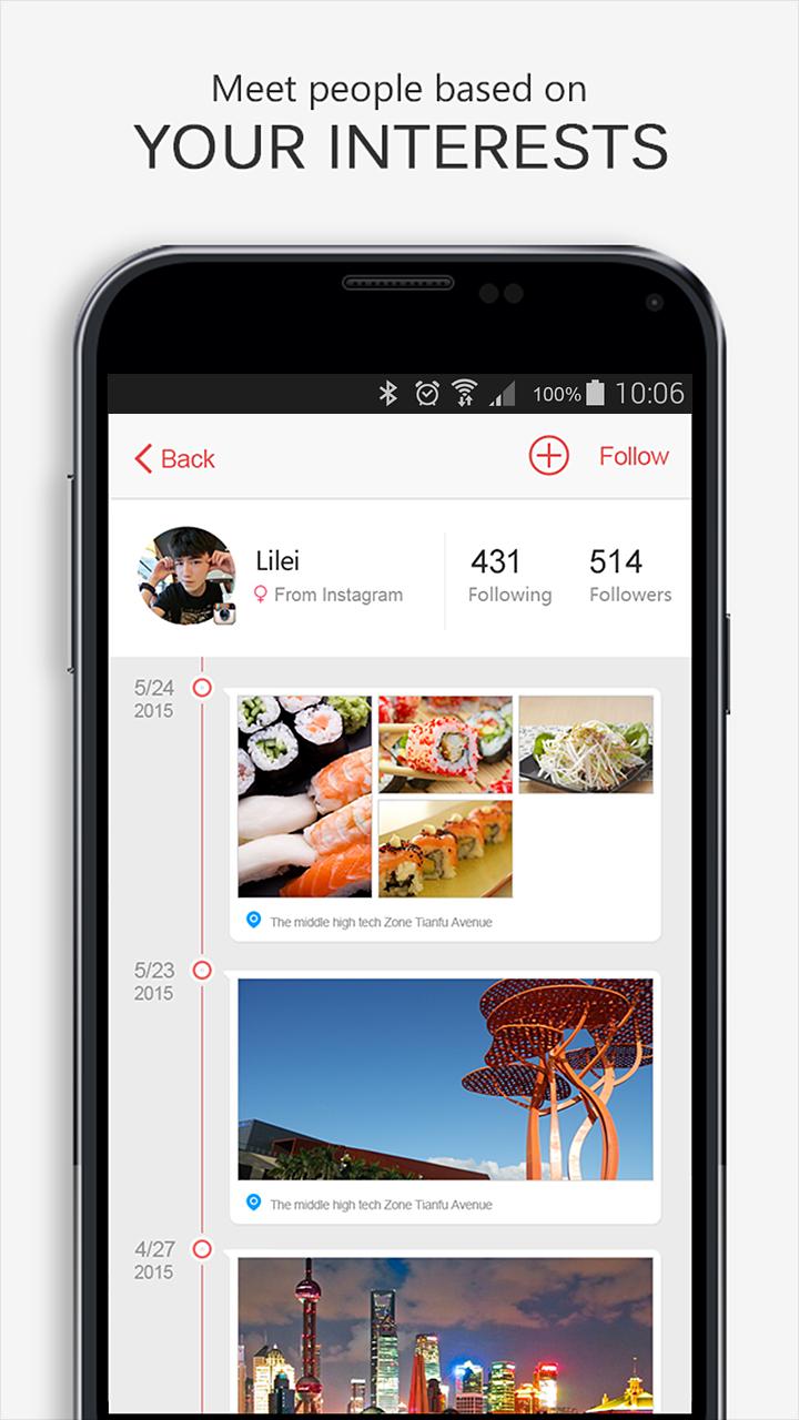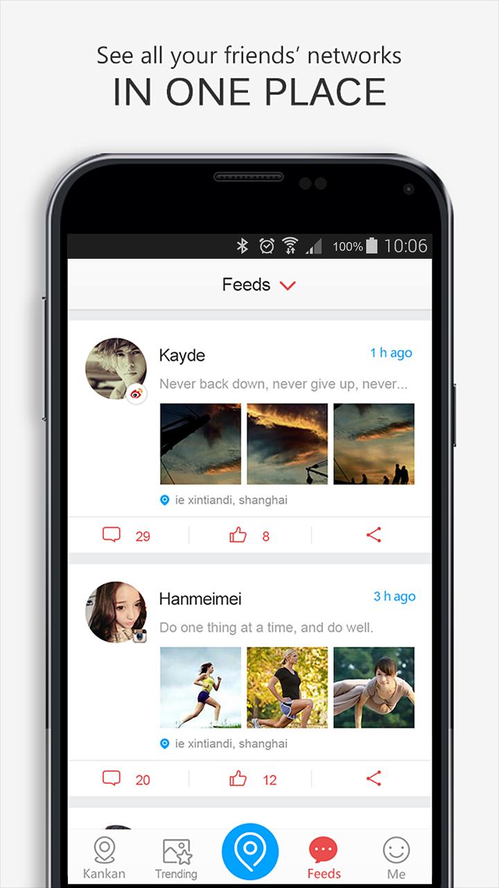 Kankan does more than keep you in touch; it helps you connect to your world. It is the world’s first app of its kind, a single platform that consolidates, manages, and enhances all of your social media accounts (including Instagram, Weibo, QQ and more) to not only help you stay on top of what’s important, but to help you make the most of where you are right now. Our custom feed works constantly to connect you to the most important content, news, events, friends and even strangers, no matter where you are or where you go.