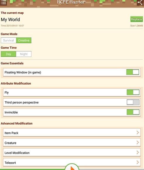 MCPE Master is an Android launcher app for Minecraft Pocket Edition. It adds several easy to use tools which greatly increase your control of the game. For example, changing the time of day and switching current gamemodes have never been easier. There are literally tons of features included in the app and to find out more continue on reading and we’ll walk you through all the features!