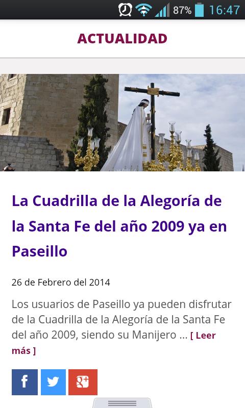 In Pasa the User may be informed of all the steps that have come out and will leave from 2010 to 2015; In the categories of Holy Week, Santerías de Gloria, Virgen de Araceli and extraordinary exits, information that will gradually expand with previous years. Each menu incorporates the information of santeros, drums, porras, etc. that make up each of the crews accompanied by the photographs of each of them. Likewise, thanks to the participation of great fans of brother photography each step is accompanied by the photograph of each procession image. To these is added a historical description of the image and the route, adding, in case the official website or blog of the brotherhood to which the headlines belong.