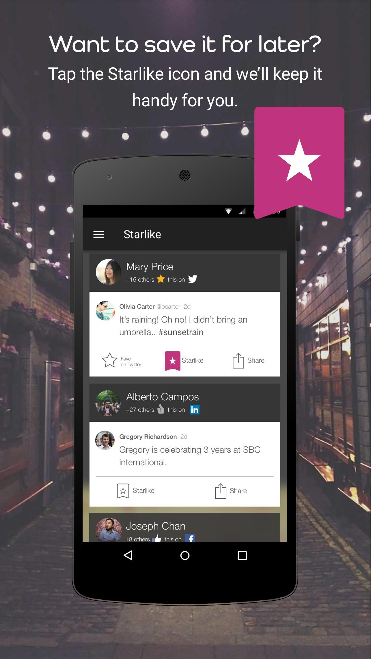 Want to fave or like something you see? You can do it right in Starlike and have it show up on that social network. Want to save something for later? Tap the Starlike icon and we’ll keep it handy for you.