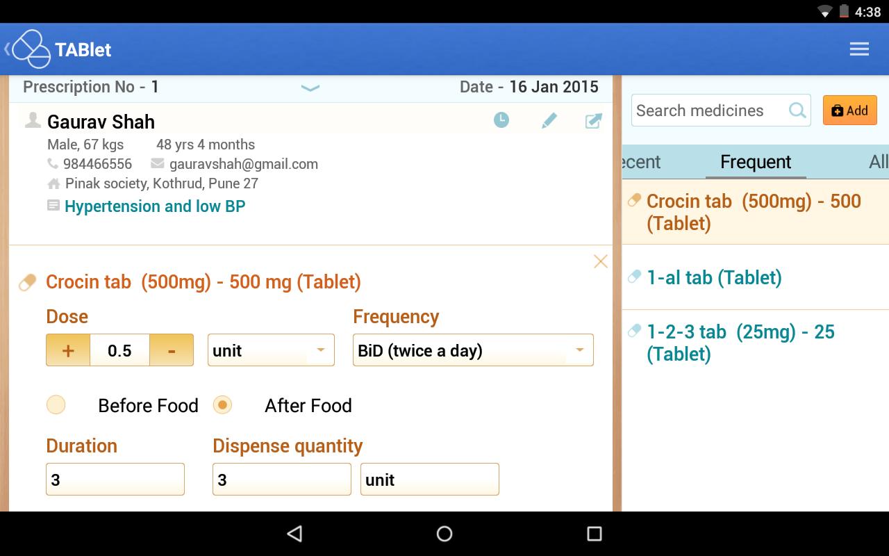 Now doctors can overcome the hassle of cumbersome paperwork by storing all their patients’ data digitally in the TABlet app. The app offers the ability to search stored patients’ data and add the patient profile details to the prescription with a single click. Doctors can view, edit and save their patient’s demographic details with ease.