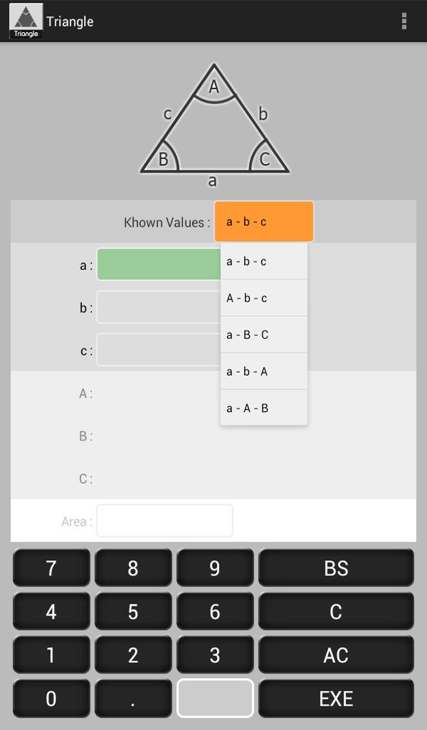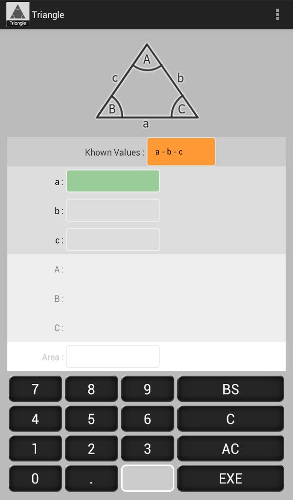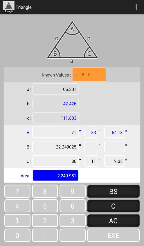 This application is used to calculate the angles A, B, C sides a, b, c and area of