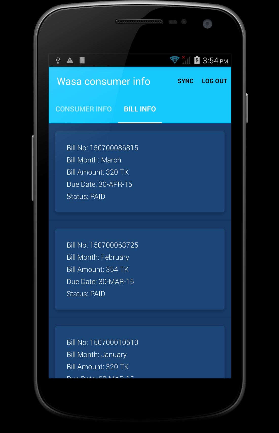 This service App allows its users (customers) to login to their WASA customer accounts. This App shows the user profile upon successful login. This App has been designed to retrieve customers’ billing information from the WASA server (invoice format). The customers will be able to find their monthly subscription details to date. The App stores necessary information after first successful login which allows the user to use this app without any internet connection (in offline mode). This App allows its user (customers) to get regular billing updates directly from the WASA, so, no third party involvement is necessary. The customers can get contact details in this App if they have any further queries regarding their bills. This App’s user interface (UI) has been designed based on Android Lollipop UI, which gives this App a new and polished, as well as a user-friendly look.
