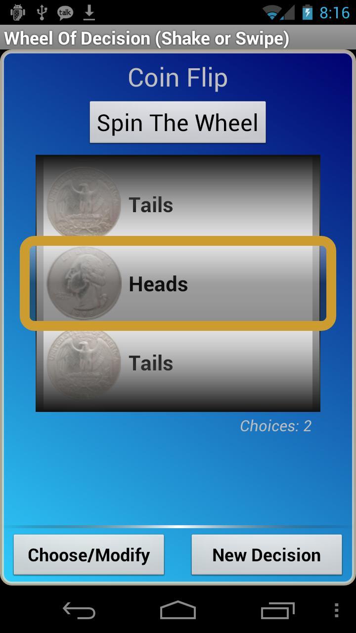 Simple to use, just choose from one of the pre-built decisions or create your own. Then shake or swipe your device to spin the wheel and reveal your answer. The spinning wheel, great graphics and sound add fun to all your decision making.