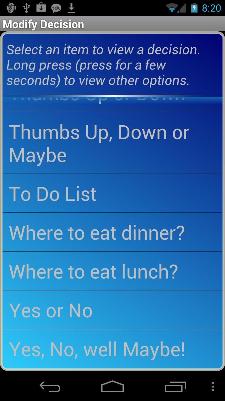 You can modify these decisions to suit your needs or create and save your own decisions. Need to make a decision involving your friends or family? You can access your contact list to add them. There are also tools to let you quickly add numbers for lotteries or other number based decisions.