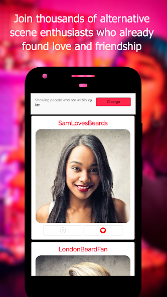 قم بتسجيل الدخول مع Facebook أو البريد الإلكتروني ، وبعد الإجابة على سؤال "هل لديك لحية" ، يمكنك البدء في البحث عن شريكك المثالي. يمكنك التصفية حسب الجنس والمسافة والعمر ، وتكون مطابقة على الفور مع الأشخاص الذين يبحثون عنك.