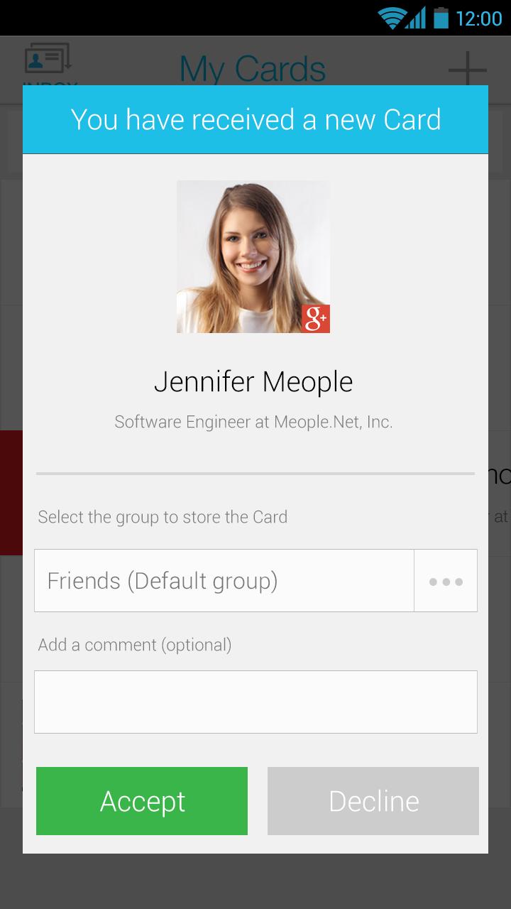 يوفر لك Meople.Connector طريقة فريدة لتبادل حساباتك الاجتماعية (أو أي حساب مخصص) بسيط مثل بطاقة العمل. إنه يعطي مجموعة من الطرق للمشاركة: تقنية NFC ، الرسائل القصيرة ، البلوتوث ، عبر البريد الإلكتروني أو إنشاء رمز QR.