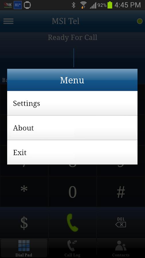 يمكن استخدام " MSI Tel " على مجموعات هاتف Android المتوافقة لإجراء مكالمات VoIP باستخدام مزود خدمة. إنها تتيح المكالمات الصوتية الدولية عبر شبكة WiFi أو 3G/4G. يمكن لمزود الخدمة الذي قام بتجميع هذا التطبيق بتقديم خدماتهم تقديم عملائهم لتنزيل MSI Tel Dialer. بعد التثبيت ، يحتاج المستخدم إلى اسم المستخدم وكلمة المرور. يرجى الاتصال بموزعك للحصول على دبوس الوصول.