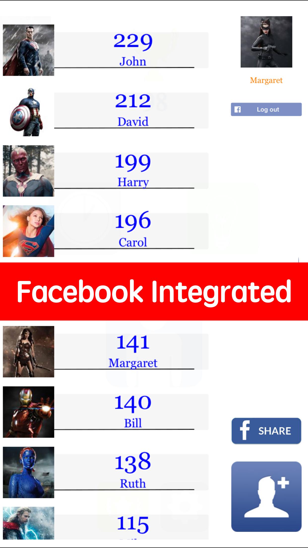 - يدمج وظائف Facebook ، مثل المشاركة إلى الأصدقاء ، ودعوة الأصدقاء ، وتحدي الأصدقاء ، وكذلك ينشر الدرجات إلى Facebook.