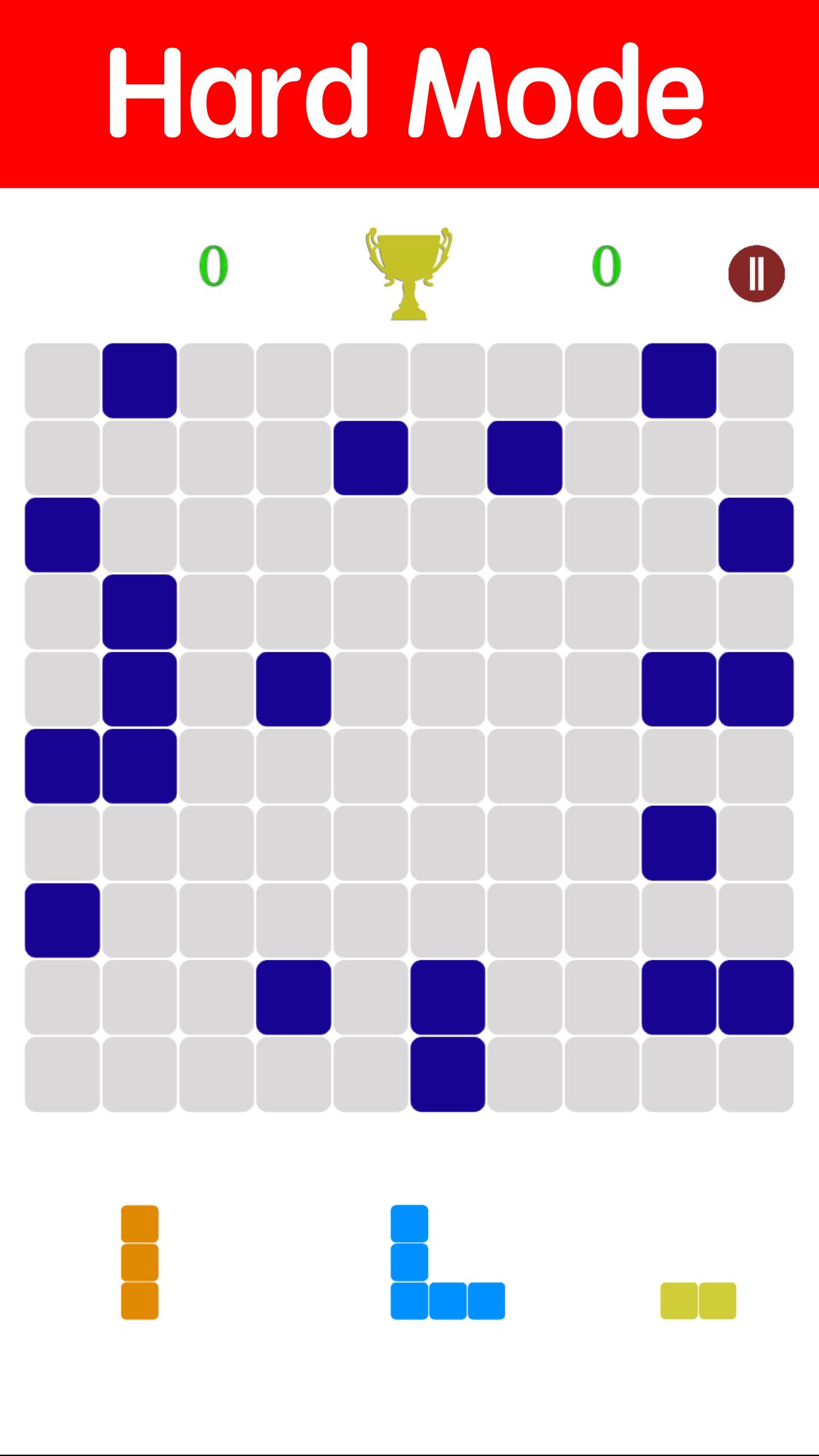 - في الوضع الصعب ، في البداية 20 كتل وضعت بشكل عشوائي. إذا كانت الكتل أقل من أو تساوي 10 كتل ، فإن 10 كتل أخرى يتم وضعها بشكل عشوائي وأيضًا الحصول على 100 درجة إضافية.