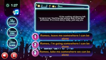تسمع جوقة الأغنية وقراءة جزء من هذه الجوقة ، إلى جانب خيارات لإكمال ما هو مفقود. التحدي الخاص بك هو اختيار البديل الذي يكمل الجوقة وفقًا لما تستمع إليه. إذا قمت بإكمال الجوقة بشكل صحيح ، فيمكنك كسب مكافأة إذا حصلت عليها أيضًا على ما هو اسم الأغنية والفرقة. عندما لا تعرف الإجابة ، يمكنك استخدام موارد المساعدة: "توقف الوقت" ، "القضاء على البديل" و "موسيقى القفز". قم بعمل أقصى نقاط يمكنك ، واستكمال أكبر عدد من الجوقات خلال الوقت الذي لديك! هذه لعبة تعليمية بالنسبة لك لتعلم الغناء بعض الأغاني الأكثر شهرة.
