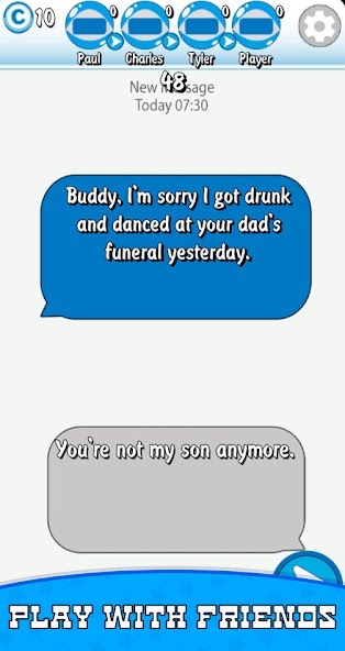 الهاتف الفكاهي الجديد الذي يوحد أربعة لاعبين يتلقون رسائل مضحكة من رقم معين ويحتاجون إلى اختيار استجابة مضحكة لهذه الرسالة في غضون 60 ثانية. بعد كل اللاعبين يختارون إجابة ، يرى كل لاعب إجابات اللاعبين الآخرين ويصوت لأطرف إجابة. لهذا السبب ، اتضح أنها لعبة مضحكة للغاية يمكنك إدخالها ليس فقط بمفردك ، ولكن أيضًا اللعب عبر الإنترنت مع الأصدقاء.