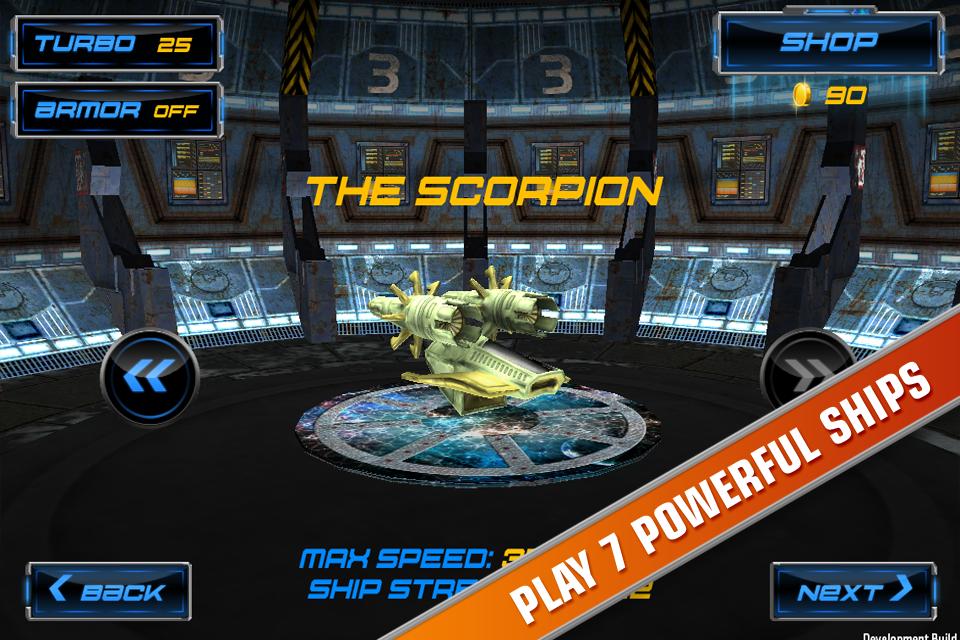 تشمل اللعبة سفينة واحدة وعالم واحد بالإضافة إلى 25 تعزيزات توربو للبدء. جمع العملات المعدنية أثناء السباق لشراء سفن وعوالم إضافية ، أو شراء حزم العملة من خلال الشراء الاختياري داخل التطبيق.