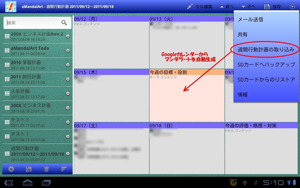 ● Fähigkeit, Ereignisse aus dem Google-Kalender zu laden und automatisch einen wöchentlichen Aktionsplan im Mandala Notebook-Stil Mandala zu generieren.