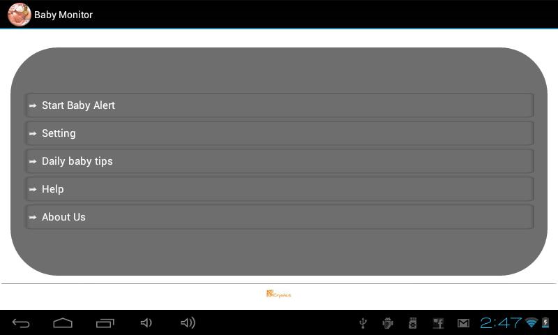 Konvertieren Sie Ihr Android -Handy in einen Babyphit. Für diese App benötigen Sie zwei Handys. Man muss Android sein und andere können von jeder Art sein. Diese App hilft Ihnen, Ihr Baby zu überwachen, während Sie woanders beschäftigt sind. Sobald das Baby zu weinen beginnt, spürt die App den Ton und ruft sofort die angegebene Nummer auf. Alles, was Sie tun müssen, ist einfach mit dieser Anwendung zu starten und Ihre Einstellungen wie Mobile No, Sound Level usw. festzulegen und Mobile in der Nähe des Babys zu halten.
