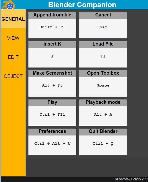 Begleit -App für die Blender 3D -Software. Schneller und einfacher Zugang zu Hotkeys.
