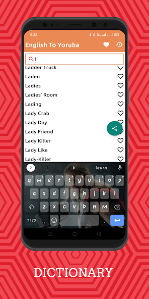 Sie können auch eine Lieblingsliste im englischen Yoruba -Wörterbuch haben. Die Yoruba -Wörter, die während der Verwendung der App zu Ihrem Favoriten werden, können Sie sie als Ihre Favoriten behalten. In der rechten Hand jedes Wortes ist ein transparentes herzförmiges Ikone da. Tippen Sie auf das Herz -Symbol und sehen Sie, wie es wie Insta rot wird.