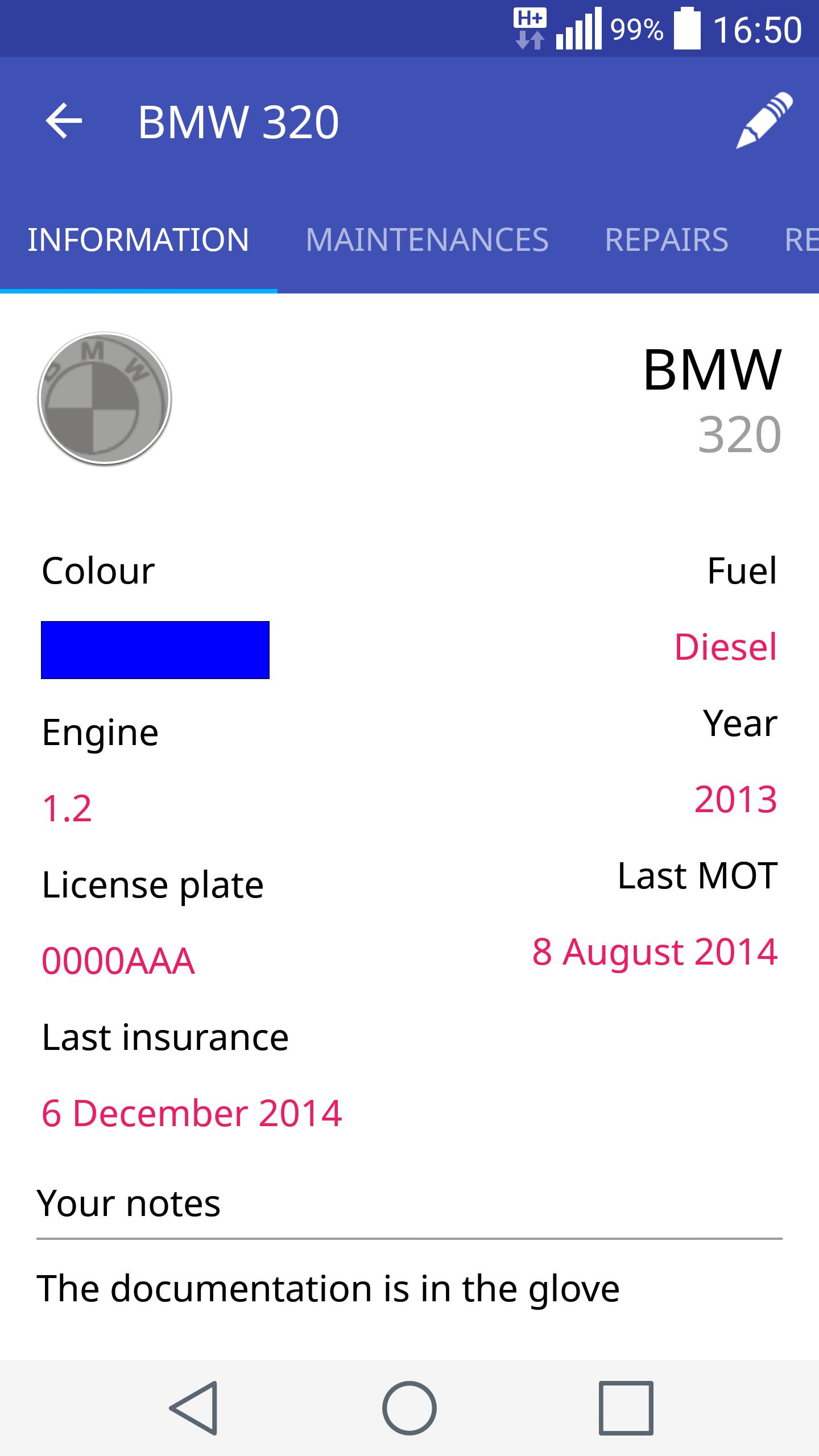 • In Ihrer Hand alle Informationen aus Ihrem Auto (Motortyp, Registrierung, Datum der letzten Versicherung, ...).
