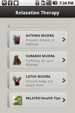 Relaxation Therapy enthält die verschiedenen Arten von Mudras und gesundheitlichen Tipps.