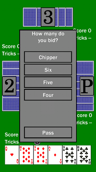 Chipper ist ein Kartenspiel in und um West Central Wisconsin. Wenn Sie mit Euchre oder einem Trick-Taking-Kartenspiel vertraut sind, sollte es ein einfaches Spiel sein. Spielen Sie gegen 3 Computerspieler, um Ihre Fähigkeiten zu verbessern und ein besserer Chipper -Player zu werden.