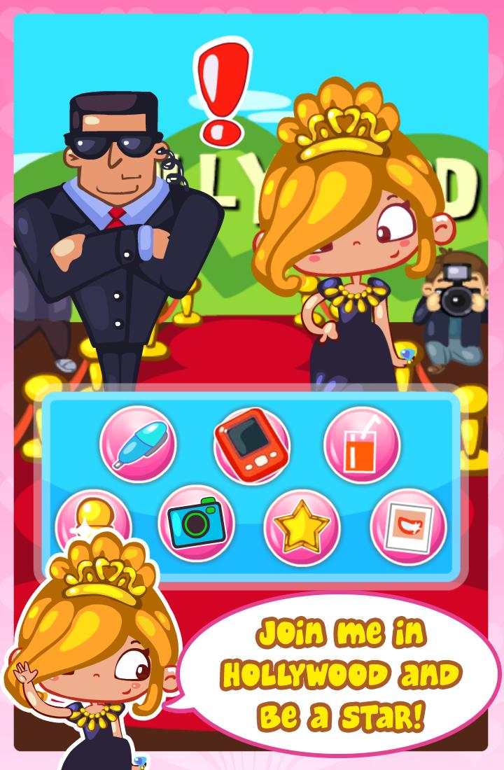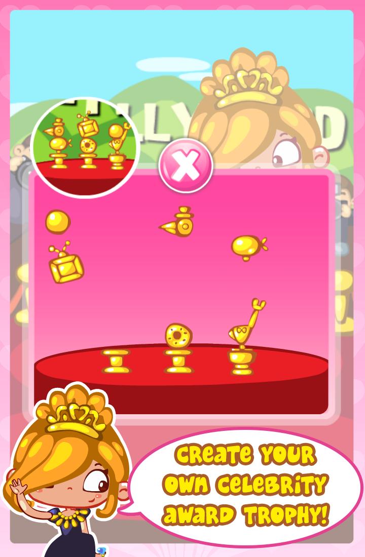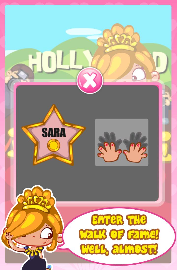 Helfen Sie Sarah, weltberühmt zu werden, indem Sie ihre Handabdrücke dem Ruhm zu Fuß hinzufügen, für Fotos posieren und ihre eigene Version der Oscars erstellen!