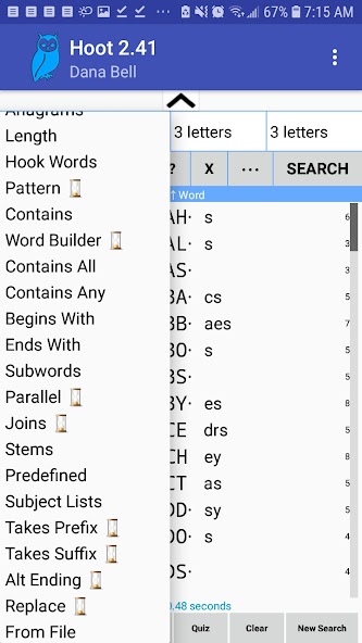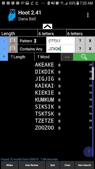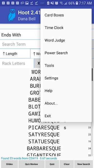 Hoot verfügt über mehrere Suchoptionen (siehe unten), und mit dem Eintragsbildschirm können Sie mehrere Parameter eingeben, einschließlich der Anzahl der Buchstaben, Anfänge und Endungen. Sie können die Sortierreihenfolge mit zwei Spezifikationen angeben (sortieren, dann nach). Die Ergebnisse werden in einem gemeinsamen Format angezeigt, das Haken und innere Haken mit Punktzahl im Rand zeigt. Sie können optional Wahrscheinlichkeits- und Spielbarkeitsranking und Anzahl der Anagramme anzeigen.