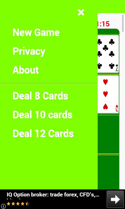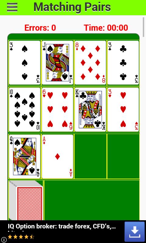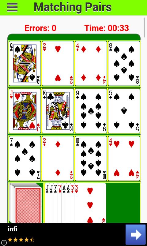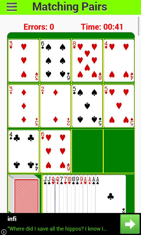 Es handelt sich um acht (8), zehn (10) oder zwölf (12) Karten aus dem Deck. Der Spieler entfernt zwei (2) Karten, die den gleichen Gesichtswert haben, indem sie nacheinander tippen oder darauf klicken. Beispielsweise wäre das Klicken auf sechs (6) Diamond und dann sechs (6) Clubs korrekt. Die beiden Karten werden automatisch durch neue Karten aus dem Deck ersetzt. Dies wird wiederholt, bis alle Karten vom Deck ausgehandelt werden. Zu diesem Zeitpunkt ist das Spiel vorbei.