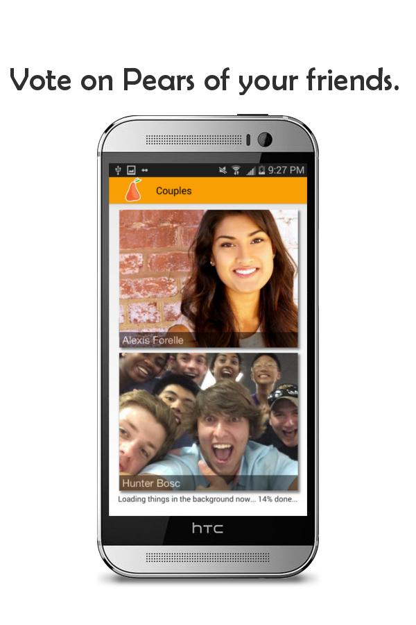 Pear ist ein neues soziales Matchmaking -Spiel, das Ihnen eine unterhaltsame Möglichkeit gibt, Paare Ihrer Freunde zu verbinden. Sie entscheiden, welche Paare Ihrer Freunde sich treffen sollten und sich besser kennenlernen sollten, indem Sie auf jedes potenzielle Paar nach oben oder unten gehen.