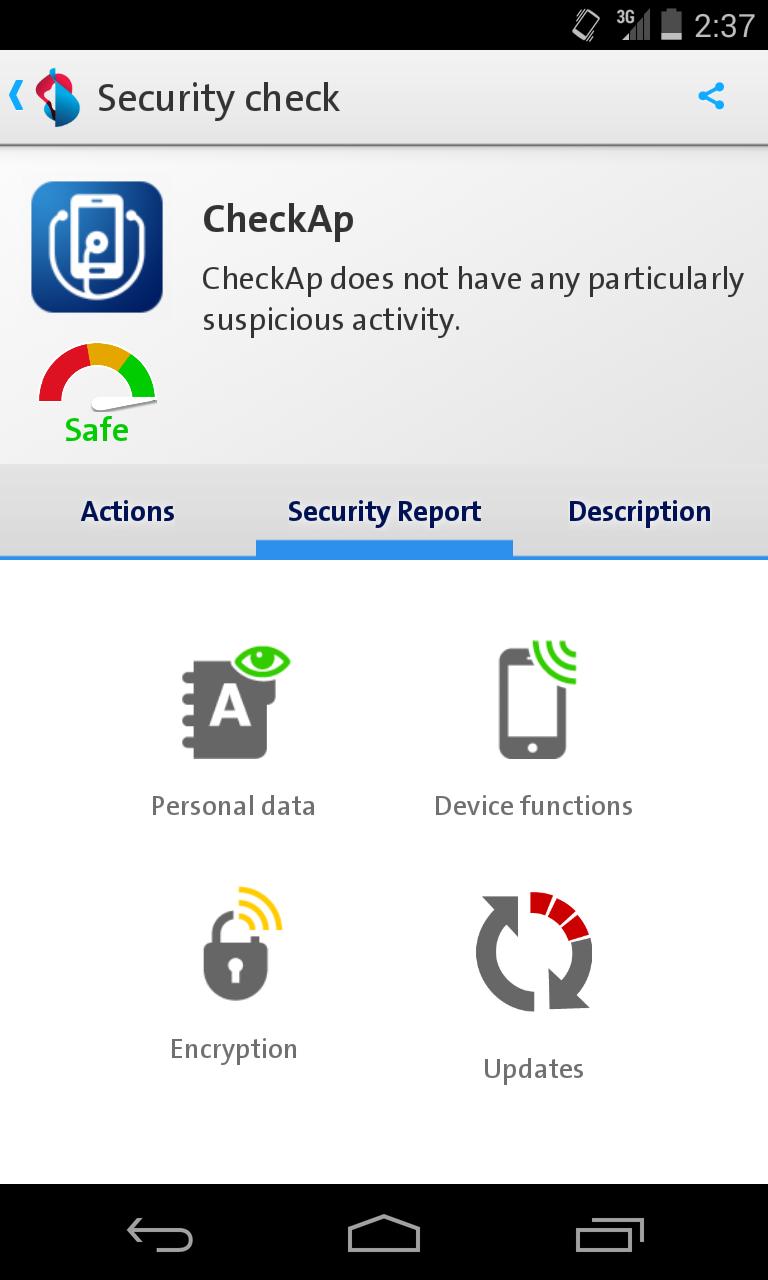 El elemento central del CheckAp es un escáner, que somete a la aplicación a una prueba detallada y muestra los resultados de inmediato, proporcionando información sobre posibilidades de acceso, por ejemplo, o cifrado de datos. CheckAp también ofrece alternativas. Y califica cada aplicación utilizando un índice de seguridad. Pero CheckAp también es una herramienta de información práctica. Para todas las preguntas relacionadas con aplicaciones móviles.