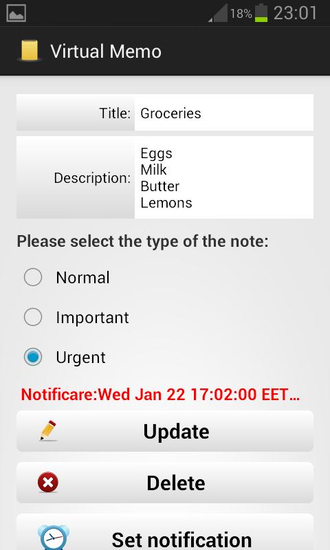 Virtual Memo es una aplicación que lo ayudará a recordar toda la tarea que tiene que hacer. Puede agregar notas y después de terminarlas puede actualizarlas o eliminarlas.