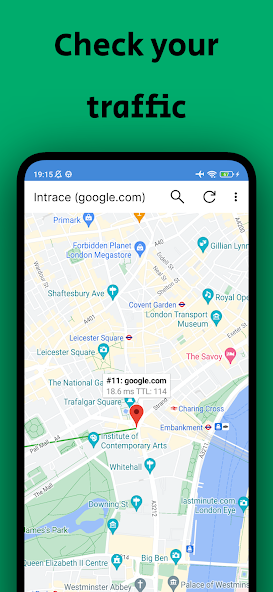 Visual Traceroute facilite l'identification des voies de données. Cet utilitaire réseau fournit des informations sur les ordinateurs et les serveurs, à travers lesquels vos données sont passées. Visual Traceroute pour Android montre non seulement la voie, mais montre également le processus de transmission sur la carte. En d'autres termes, Intrace pour Android montre les adresses des serveurs et leur emplacement.