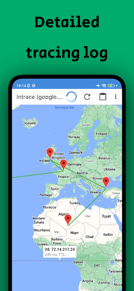 Intrace pour Android utilise des commandes "ping" spécifiques, qui sont généralement disponibles sur la plupart des appareils (smartphones, tablettes, ordinateurs portables, PC, etc.). La base de données d'application vous aide à identifier l'emplacement géographique de tout le chemin des données de paquets de transmission.