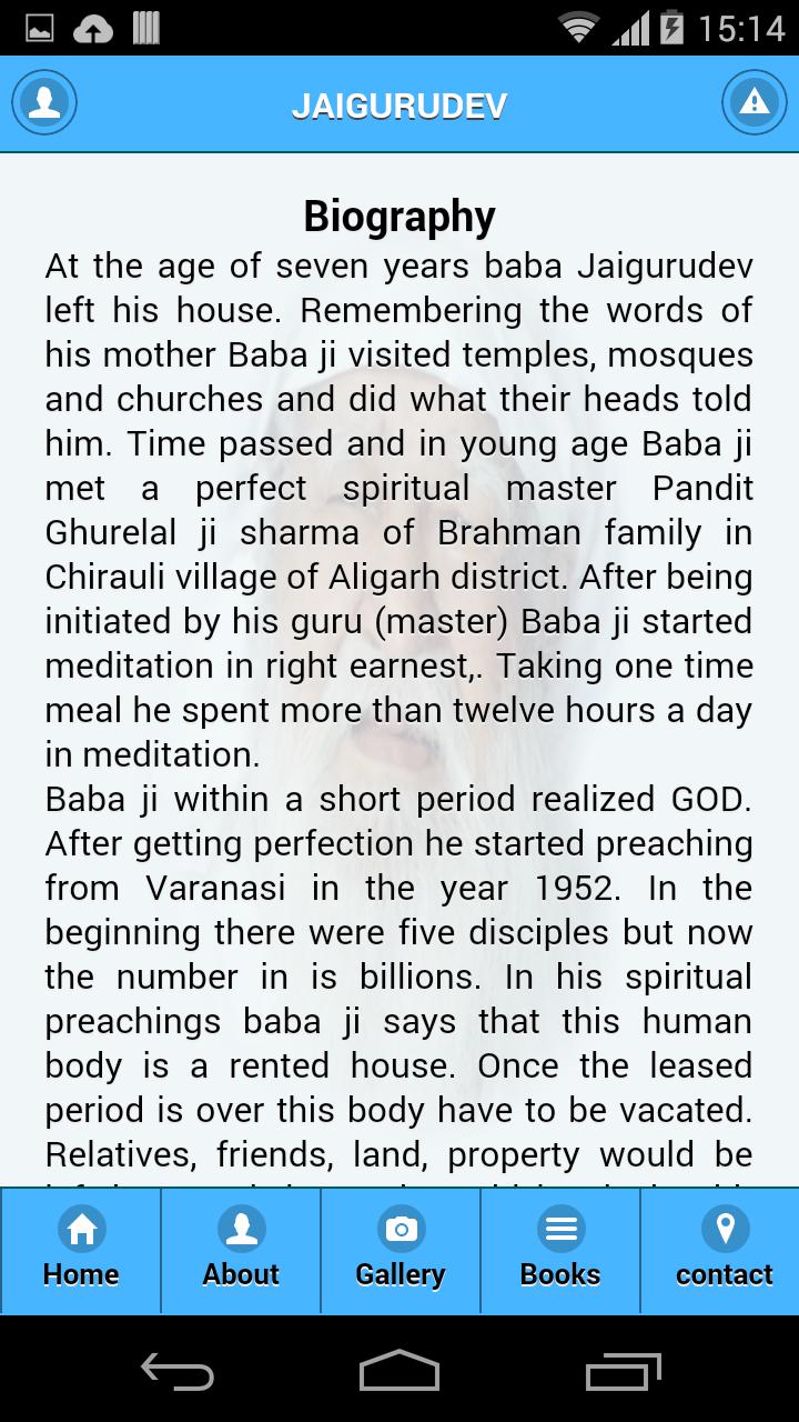 Ce grand puissant Saint Baba Jai Gurudev a prêché pour l'élévation de l'âme à travers ses discours religieux sous le nom de "Jai Gurudev" qui est le nom de Dieu. Ce grand saint attribue l'état actuel de l'humanité aux cinq faiblesses intérieures de l'homme: c'est-à-dire la luxure, la colère, la cupidité, l'attachement et l'égoïsme. Le saint est donc occupé jour après jour dans ce qu'il appelle "la reconstruction du vrai temple - le corps humain", un travail que seul un grand saint puissant peut faire.