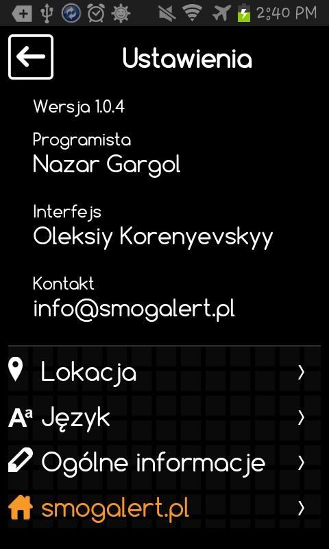 Application de surveillance de la qualité de l'air pour les villes polonaises. Fournit des statistiques de base de polluants tels que: SO2, NO2, PM10 et PM2.5. Montre le pourcentage actuel de pollution selon les normes de santé.