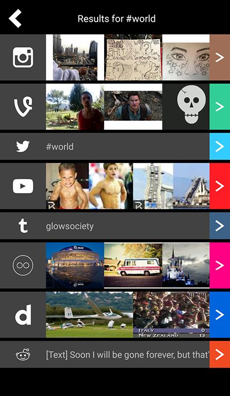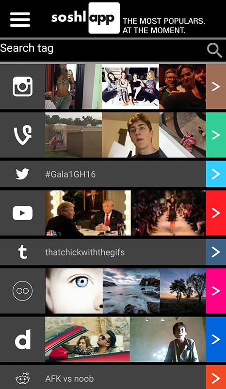 SoshlApp rassemble et combine le contenu le plus populaire de certains des médias sociaux; Twitter, Instagram, Vine, Reddit, TMBLR, YouTube, Flickr et Dailymotion.