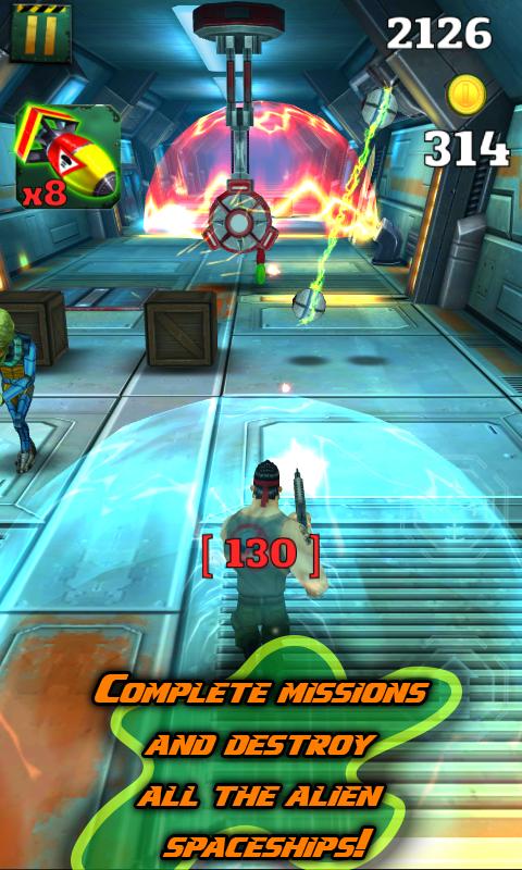 Who can stop you? Run through the jungle to fight the horde of horrible and slimy alien creatures from other worlds! The mission is to destroy all the alien spacecrafts's cores and eliminate the enemy.