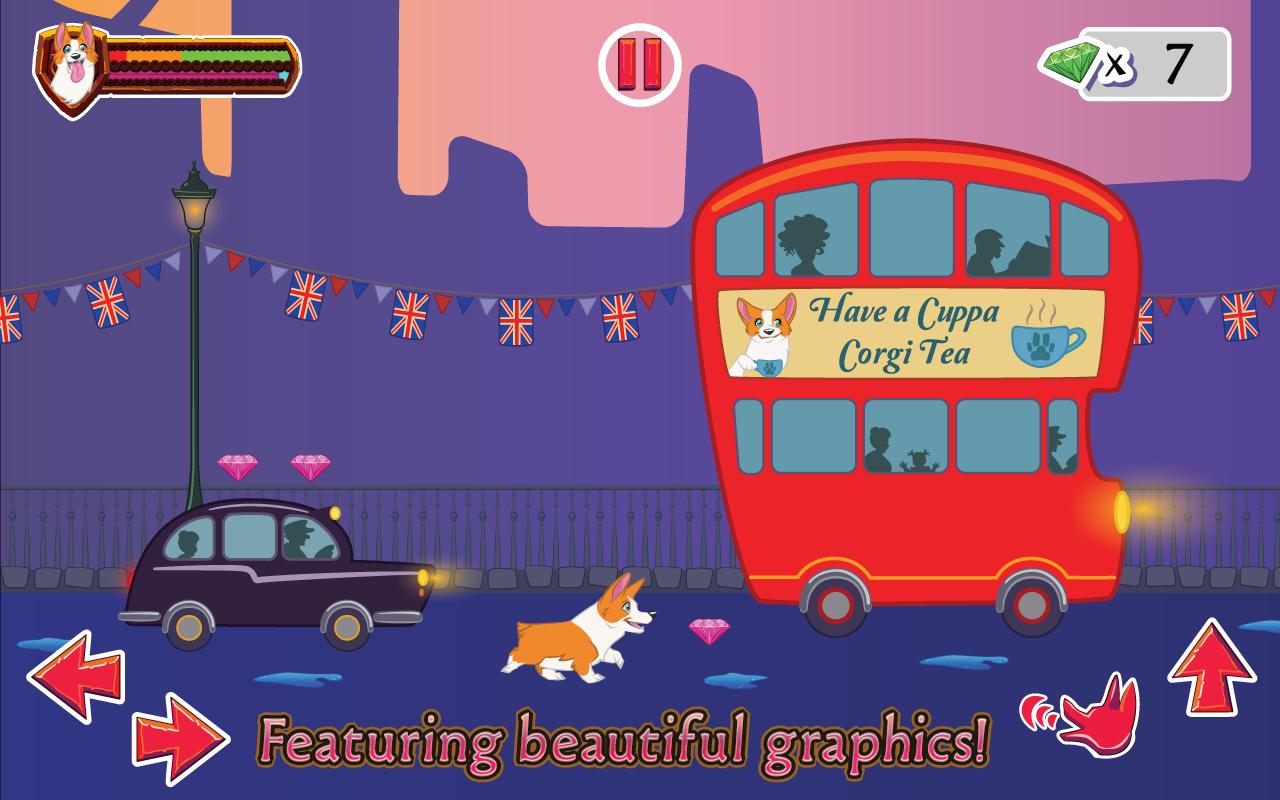 The Queen of England has been kidnapped by aliens! Help this loyal corgi, Sir Woofs-a-lot III, save Her Royal Majesty. Run, jump and bark your way through the boroughs of London and the wilds of the English countryside in this side-scrolling adventure. Battle alien brain slugs to restore order within the kingdom and "Dog Save the Queen".
