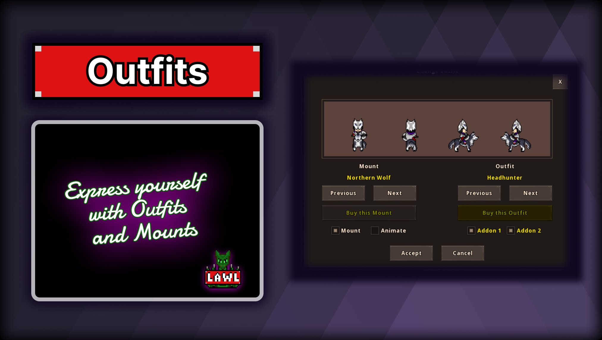 - Customize your character, with outfits and addons