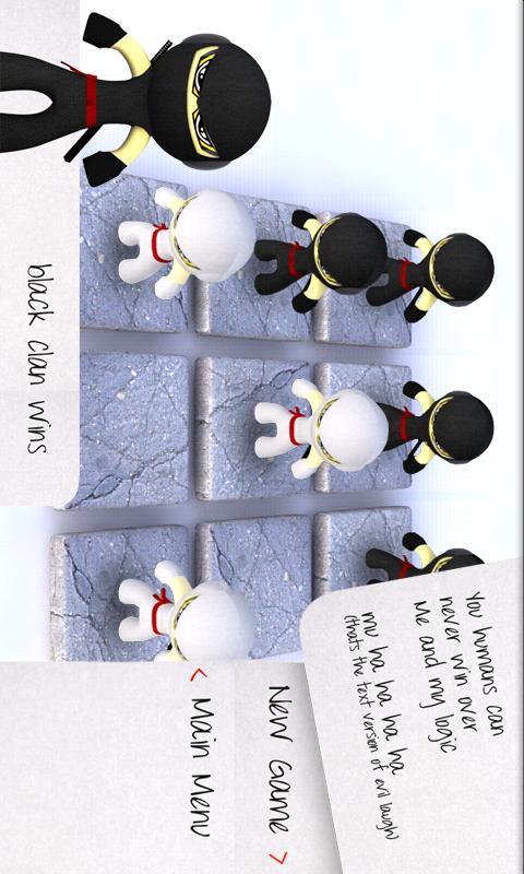 Someone has let loose cute Black Ninjas onto the Tic Tac Toe Board. The evil Black Ninja Clan wants to take over the world and steal all our Pizza. Do not panic though, the White Ninja clan is standing by to repel them, but they need you to guide them. Don the role of the White Sensei and defeat the dastardly plans of the black clan.